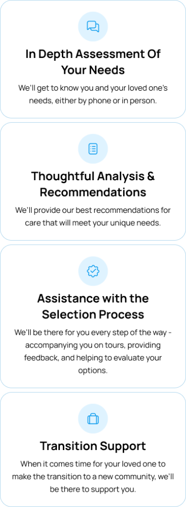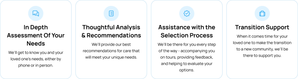 The most optimal services are tailored to meet specific needs—whether that includes support with activities of daily living. Our senior care advisors act as a liaison to help families find appropriate care in their general vicinity. If you’re seeking assisted living options or simply looking into senior home care services, our team of senior care advisors will guide you in finding the most compatible option. These are just a handful of the ways in which we can be of service: